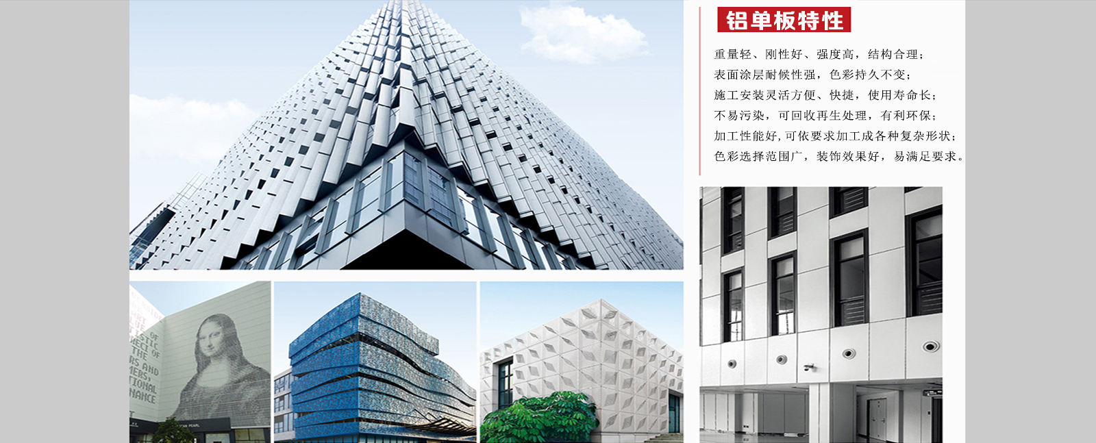 臨朐筑隆金屬制品有限公司產(chǎn)品涵蓋:幕墻鋁單板、仿銅拉絲鋁單板、木紋轉(zhuǎn)印鋁單板、仿石材鋁單板、氟碳噴涂等,擁有完整、科學(xué)的質(zhì)量管理體系,是集設(shè)計(jì)、生產(chǎn)制作、銷(xiāo)售服務(wù)于一體的幕墻鋁單板生產(chǎn)廠家。 產(chǎn)品款式新穎,大方。產(chǎn)品可應(yīng)用于:建筑物外墻、梁柱、門(mén)頭、陽(yáng)臺(tái)、雨棚、廣告牌、室內(nèi)建筑裝飾、商業(yè)大樓、別墅、隧道、門(mén)面招牌、會(huì)所、廠房、圖書(shū)館、4s店、飯店、售樓部、機(jī)場(chǎng)、地鐵、輕軌、車(chē)站、展館、醫(yī)院、行政辦公大樓,會(huì)議廳、體育場(chǎng)館、歌劇院、家居等各種場(chǎng)所。?公司擁有一批設(shè)計(jì)管理人才。在生產(chǎn)經(jīng)驗(yàn)上,堅(jiān)持“顧客至上、質(zhì)量至上、服務(wù)至上”的宗旨,為您營(yíng)造美好的合作體驗(yàn)。 秉承“以客戶(hù)和我們共成長(zhǎng)、我們與客戶(hù)共進(jìn)步”的雙贏理念,堅(jiān)持“用戶(hù)至上”的服務(wù)宗旨,以誠(chéng)信獲得廣大消費(fèi)者的青睞,銷(xiāo)往多個(gè)省市,獲得了各界的好口碑。愿我們的真誠(chéng)、我們的努力得到廣大客戶(hù)朋友的認(rèn)可和支持。公司秉承“個(gè)性定制,品質(zhì)服務(wù)”的經(jīng)營(yíng)理念,并按照標(biāo)準(zhǔn)化、系統(tǒng)化、科學(xué)化的要求......